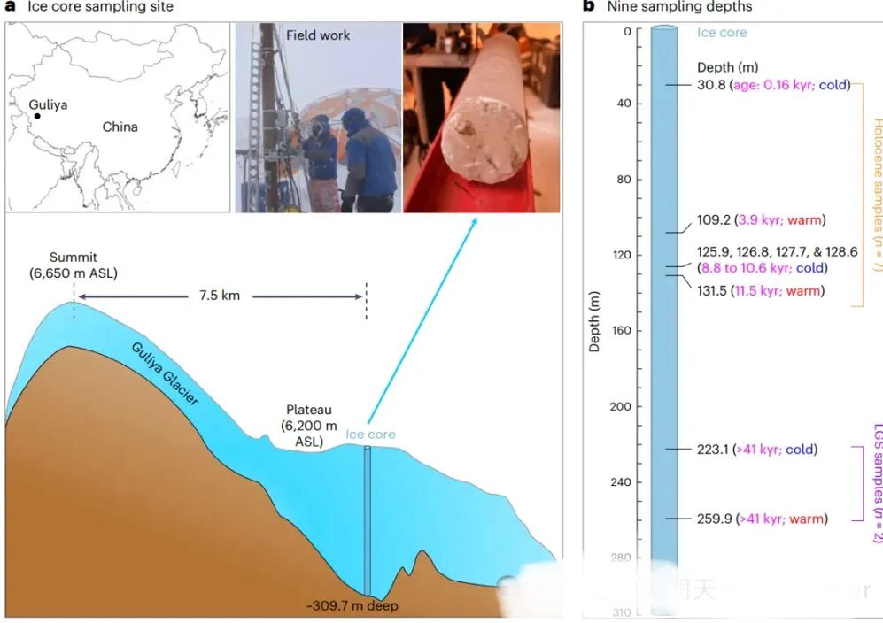 圖1. 冰川冰采樣。a. 在中國西部的古里亞冰川高原進(jìn)行了鉆探,海拔6200米。在冰川表面鉆探了一個(gè)309.7米長的冰芯。為了比較,我們之前對(duì)病毒的研究來自在山頂(海拔6650米)鉆探的冰芯。b. 從冰芯中采樣了九個(gè)深度,跨越兩個(gè)主要?dú)夂驎r(shí)代:全新世和末次冰期(LGS)。黑色數(shù)字表示從冰芯表面開始的深度,品紅色文本提供了相應(yīng)的重建年齡,藍(lán)色/紅色文本指示寒冷/溫暖的古氣候條件。